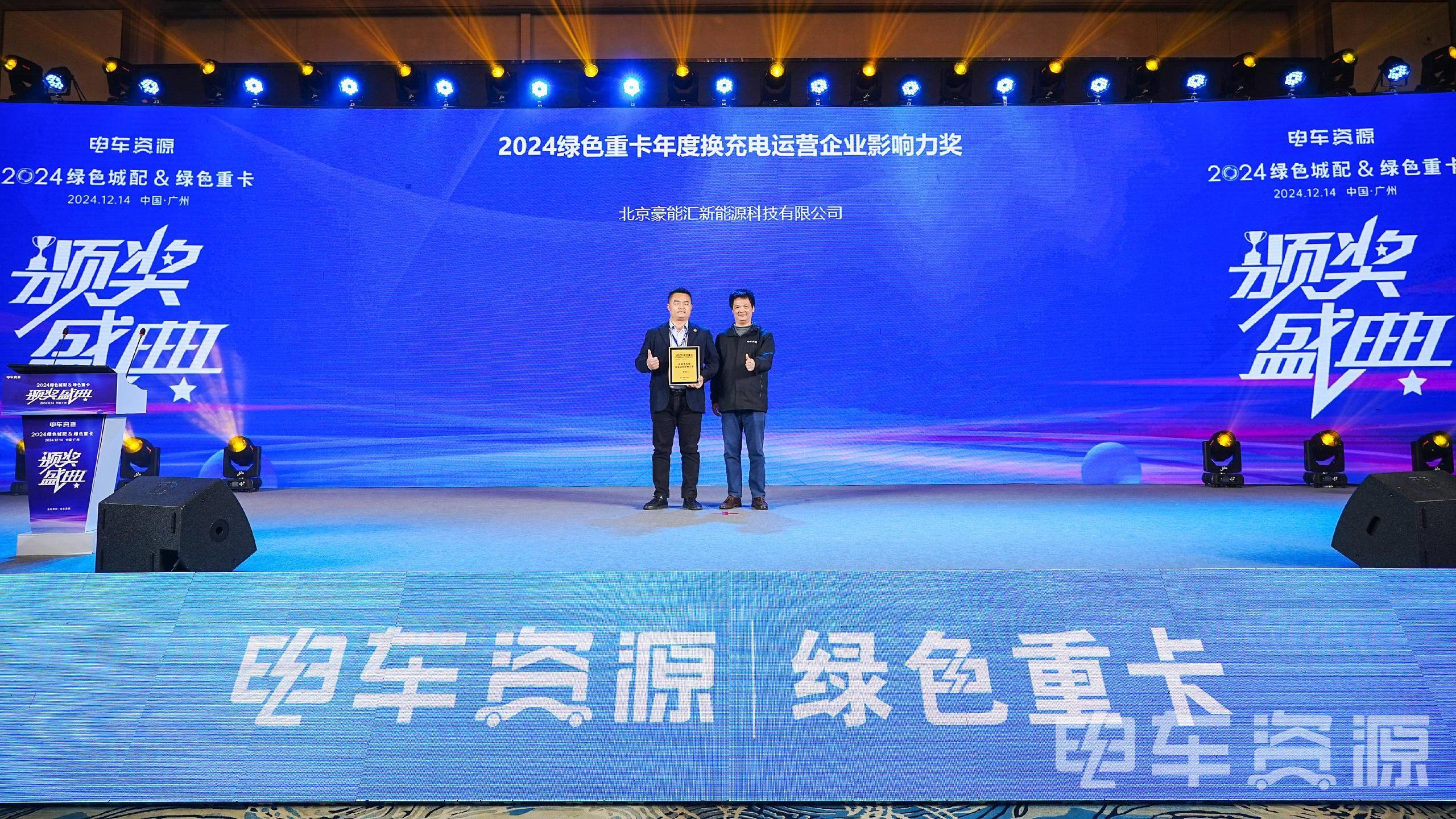 2024年12月14日,由电车资源主办的“2024 中国新能源重卡运营大会”在广州隆重举行,“2024 绿色城配&绿色重卡年度颁奖盛典”同期举行。豪能汇新能源凭借在换充电领域的卓越表现,荣获“重卡补能类”“2024绿色重卡年度换充电运营企业影响力奖”。