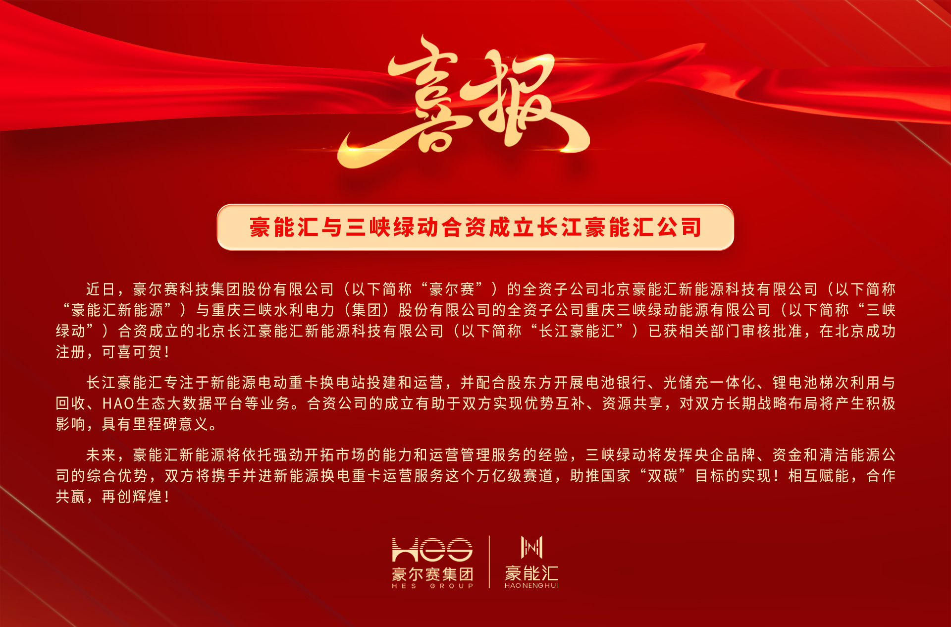 近日,豪尔赛科技集团股份有限公司的全资子公司北京豪能汇新能源科技有限公司与重庆三峡水利电力(集团)股份有限公司的全资子公司重庆三峡绿动能源有限公司合资成立的北京长江豪能汇新能源科技有限公司已获相关部门审核批准,在北京成功注册。合资公司的成立有助于双方实现优势互补、资源共享,对双方长期战略布局将产生积极影响,具有里程碑意义。