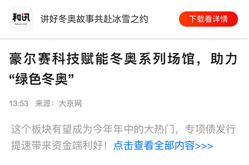 冬奥会不仅是世界级的体育盛事,而且是企业科技创新成果的展示窗口,更是展现国家形象、振奋民族精神的重要契机。作为深耕智慧领域的科技创新型上市企业,豪尔赛科技集团股份有限公司(以下简称“豪尔赛”)表示,在承建冬奥项目之初,便已全面贯彻落实北京冬奥组委各项工作要求,紧密遵循“简约、安全、精彩”的办赛宗旨,高质量高标准参与冬奥会筹办建设及服务保障工作,为办好一届精彩、非凡、卓越的奥运盛会贡献出自身的智慧与力量。
