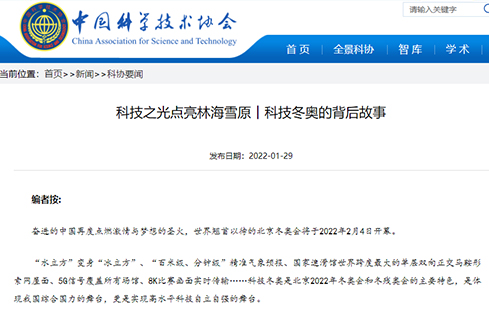 编者按: 奋进的中国再度点燃激情与梦想的圣火,世界翘首以待的北京冬奥会将于2022年2月4日开幕。 “水立方”变身“冰立方”、“百米级、分钟级”精准气象预报、国家速滑馆世界跨度最大的单层双向正交马鞍形索网屋面、5G信号覆盖所有场馆、8K比赛画面实时传输……科技冬奥是北京2022年冬奥会和冬残奥会的主要特色,是体现我国综合国力的舞台,更是实现高水平科技自立自强的舞台。 中国科协网开设“科技奥运的背后故事”专题,挖掘冬奥高科技的幕后故事、幕后英雄,展现中国科协所属全国学会及广大科技工作者在“