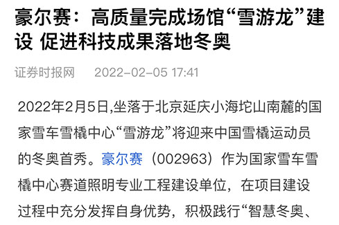 2022年2月5日,坐落于北京延庆小海坨山南麓的国家雪车雪橇中心“雪游龙”将迎来中国雪橇运动员的冬奥首秀。豪尔赛(002963)作为国家雪车雪橇中心赛道照明专业工程建设单位,在项目建设过程中充分发挥自身优势,积极践行“智慧冬奥、绿色冬奥”的建设理念,促进科技成果落地冬奥。