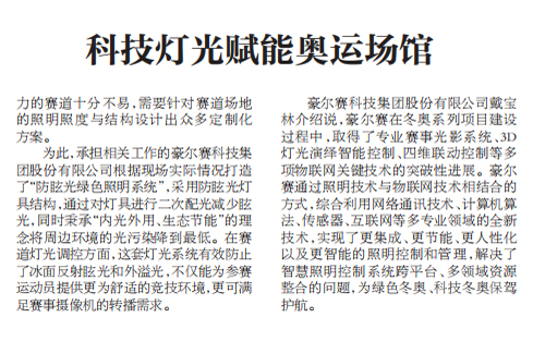 2月20日晚,北京2022冬奥会圆满闭幕。中国体育代表团在赛场奋勇拼搏、表现出色,夺得了9枚金牌、4枚银牌、2枚铜牌,取得了我国参加冬奥会的历史最好成绩,为祖国和人民赢得了荣誉,向全世界呈现了一场精彩的冰雪盛宴。据统计,2022年北京冬奥会场馆共计25个,豪尔赛科技集团股份有限公司(以下简称“豪尔赛”)参与了10余个场馆的智慧照明建设。豪尔赛运用数智化技术成果为赛事赋能,圆满完成了冬奥场馆建设及保障任务。