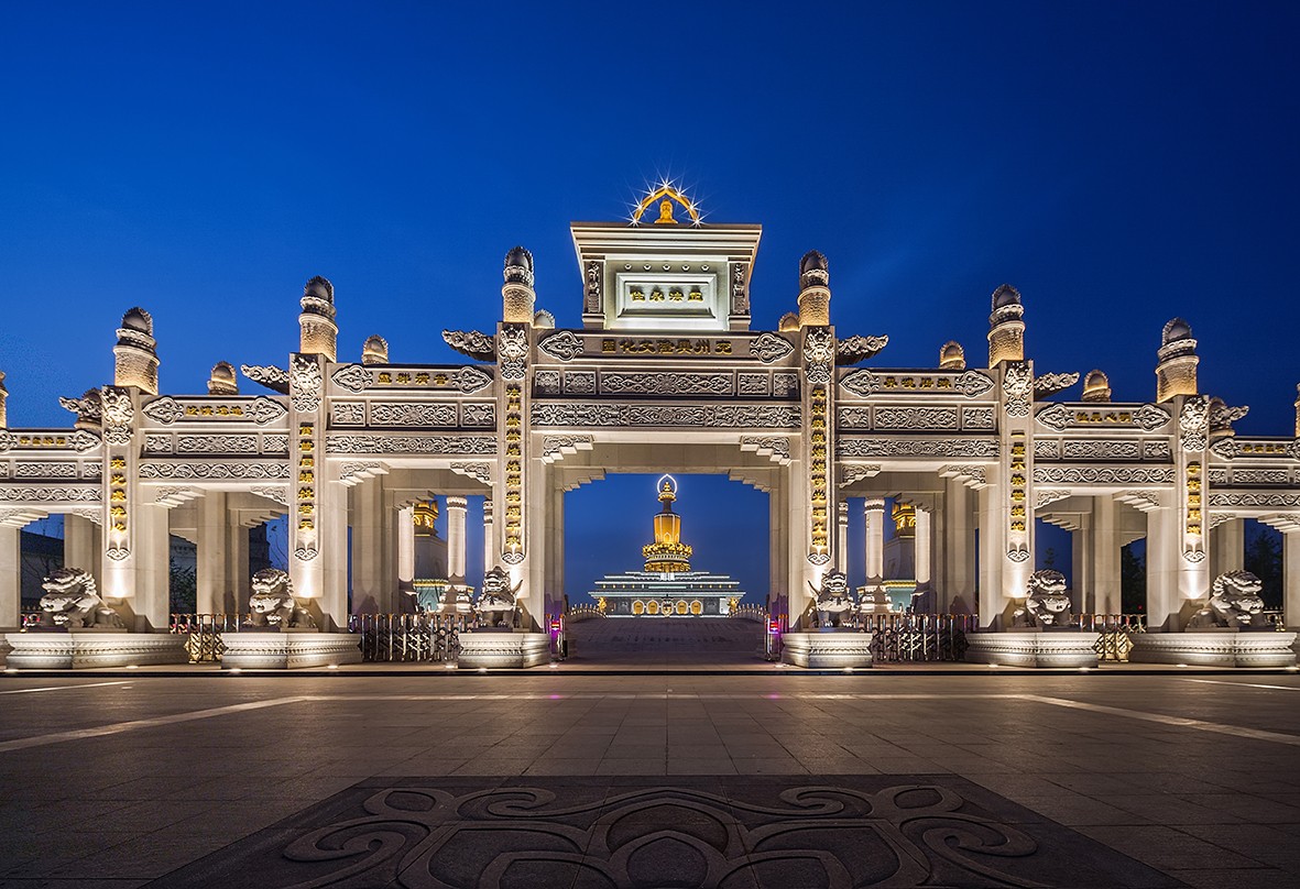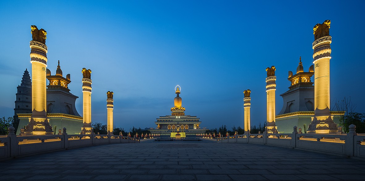 兴隆文化园主体建筑雄伟、气势恢宏、金世尊安然屹立在城市之巅。从金碧辉煌的舍利金瓶、寓意国泰民安的天王护法,到气势如虹的灵光宝殿、吉时升起抛洒甘露的观音水法,再到暗藏神秘地宫、出土珍奇国宝的千年古塔兴隆塔,精美绝伦的现代艺术创作与庄严悠久的历史积淀相互辉映。