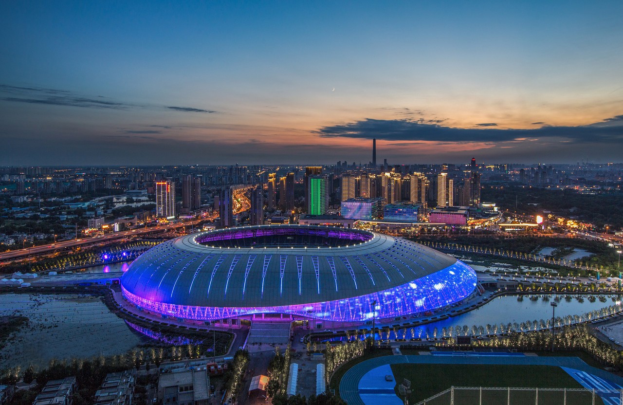 天津奥体中心位于天津西南,为天津市地标性建筑,这座占地面积8万平方米的体育场,总建筑面积15.8万平方米,功能齐全,设施先进。体育场主体结构南北长407.3米,东西宽284.6米,标高53米,设有主席台座位518个,记者席座位272个,观众席座位6万个,配备卖场、展馆、会议厅、健身房等辅助设施,集休闲、娱乐、健身、购物等功能于一体。设计了8条400米椭圆形跑道,一条直线道可供足球及田径比赛,此外,场地内还可以举办大型文艺演出、集会和展览等活动。